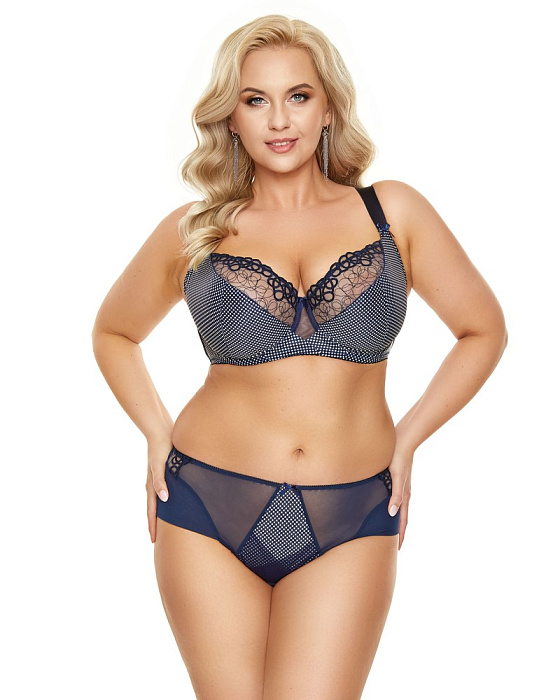 Мягкая чашка на косточках. Нижняя часть чашки - плотный неэластичный материал с принтом черного цвета, верхняя - узорная вышивка на сетке в тон.