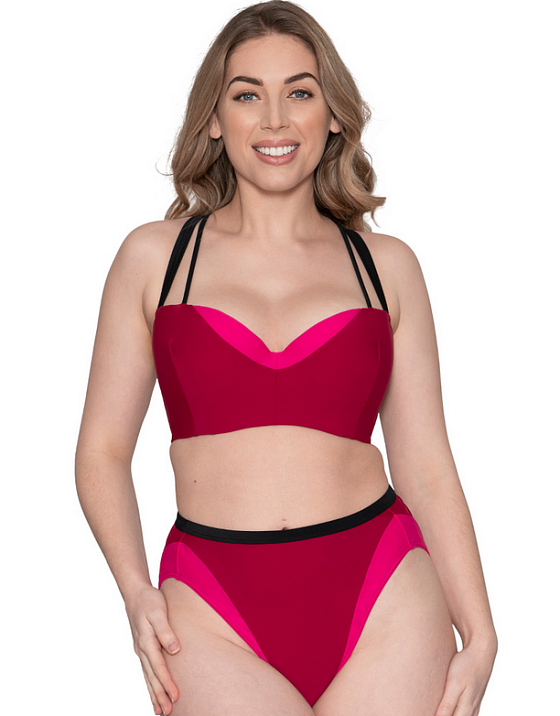 Яркий купальник Subtropic от Curvy Kate в смелом дизайне  будет выглядеть сногсшибательно как на пляже, так и в бассейне!  Глубокий оттенок пурпурно-розового уже несколько сезонов не выходит из моды и успел стать некоторой классикой в мире пляжной моды. Бра эффектно приподнимает грудь, собирая её с бочков и образуя шикарное декольте. Контрастные бретели регулируются по всей длине, сзади отстегиваются, соответственно их можно фиксировать различными способами. Надёжная поддержка груди осуществляется за счет вертикальных швов в чашке и плотно сидящего пояса. В таком купальнике вы будете королевой пляжа!