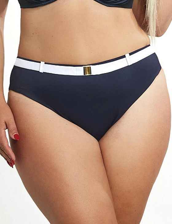 Стильные плавки от польского бренда Крис Лайн выполнены из эластичного полотна тёмно-синего цвета с принтом в виде белых полос; на талии декоративный пояс. Глубокие вырезы визуально делают ноги длиннее, создавая эффектный и соблазнительный образ.