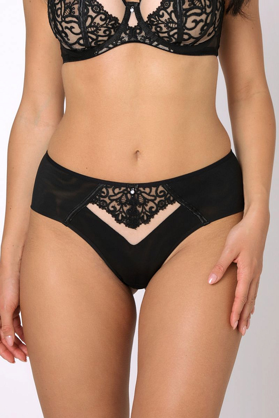 Трусики бразильяна классической посадки с широким бочком. Модель выполнена двойного микротюля со вставками кружевной вышивки.