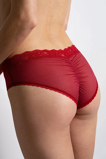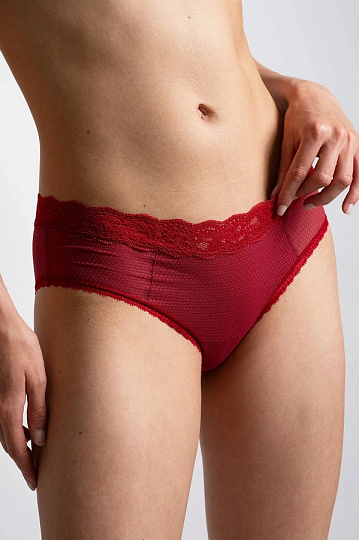Трусики-слип из мягкой микрофибры и микросетки. Со средней посадкой на талии и широкой боковиной. Фронтальная часть выполнена из плотной эластичной ткани. Область ягодиц закрыта ажурной микросеткой с цветочным орнаментом.